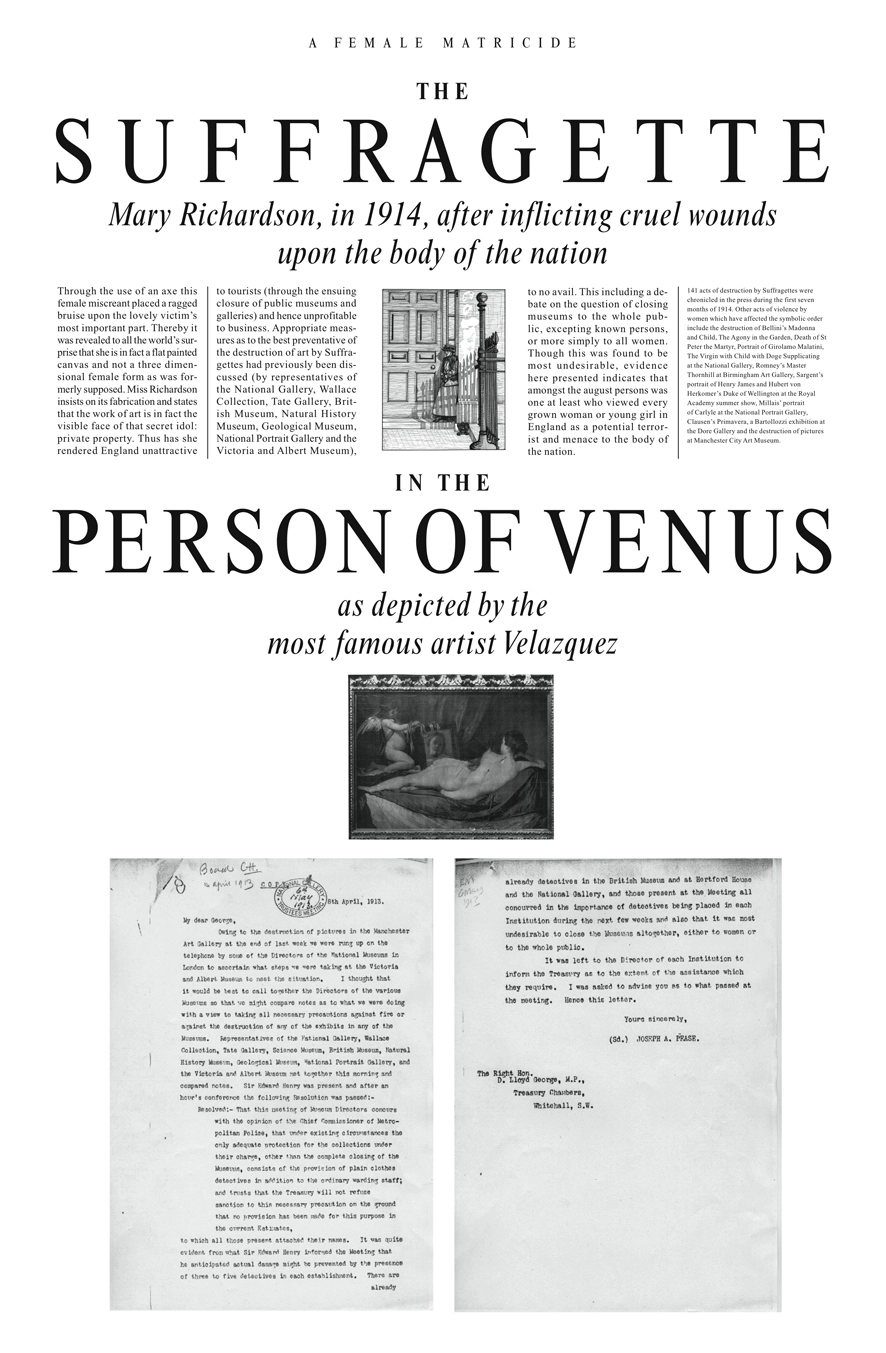The exhibition also included a series of allegorical posters, which circle around the themes of history, nationalism and the financial system. The posters depict events ranging from the suffragette Mary Richardson’s attack on the Velázquez painting of Venus at the National Gallery in 1914, to the use of anti-terrorist law by the British government to seize Icelandic bank assets, following the 2008 banking collapse. Playing with genres such as broadsheet announcements of monstrous animals, newspaper front pages and theatre playbills, they draw on my long-standing interest in the history of political satire and popular printing.