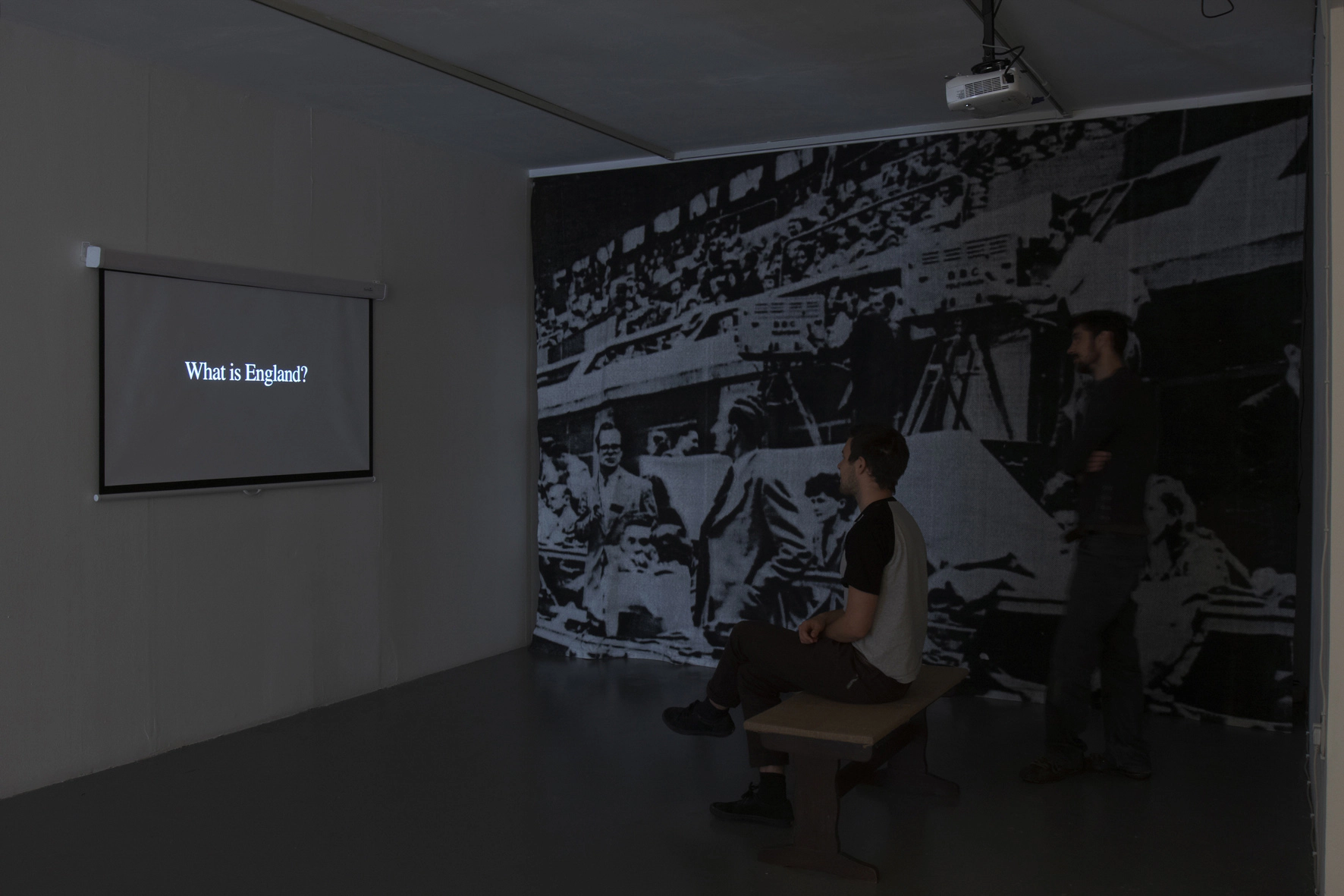 What is England?, 2009, video, 35 min. 2 sec., printed fabric banner, in ‘Aadieu Adieu Apa (Goodbye Goodbye Father)’, Gasworks, London