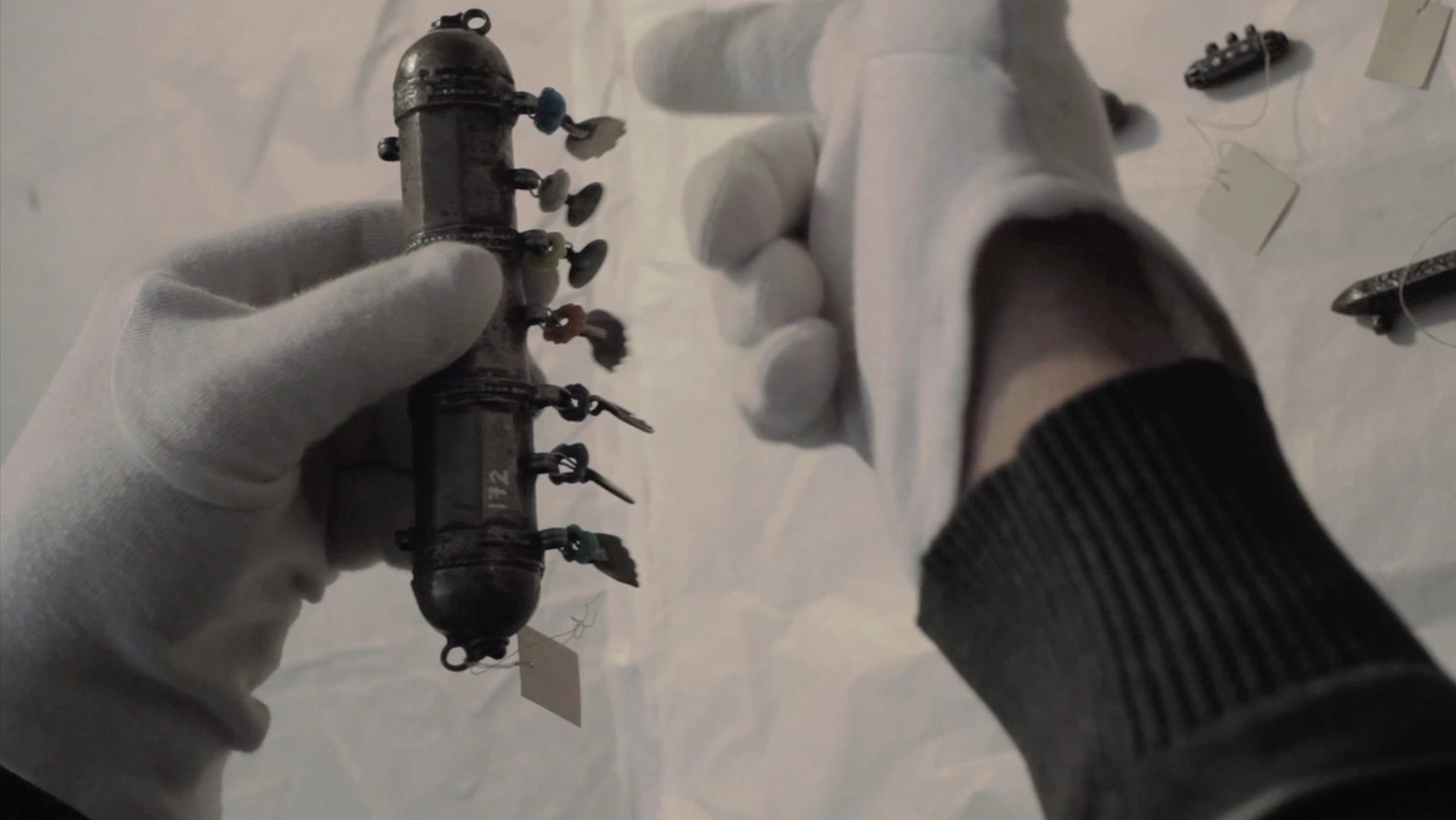 The viewer enters the space and hears a voice describing a collection of magical amulets, which was assembled by Tawfiq Canaan, a Palestinian doctor and amateur ethnographer based in Jerusalem, in the decades before 1948 and the Nakba. From time to time we glimpse a pair of white-gloved hands carefully showing one of the shiny amulets to the camera, as Baha Jubeh, the collection’s curator, tells us each object’s story. Canaan documented the folk healing practices of Palestinian villages, because he found that it was necessary to understand people’s beliefs in order to treat them successfully. The curator describes the danger attributed to the act of looking and how envy is deflected by the amulets as they dazzle the eye. But the inaccessibility of the image highlights the fragility of the collection, as he struggles to preserve the history of these now anonymous villagers, as did Canaan and his family after the Nakba.