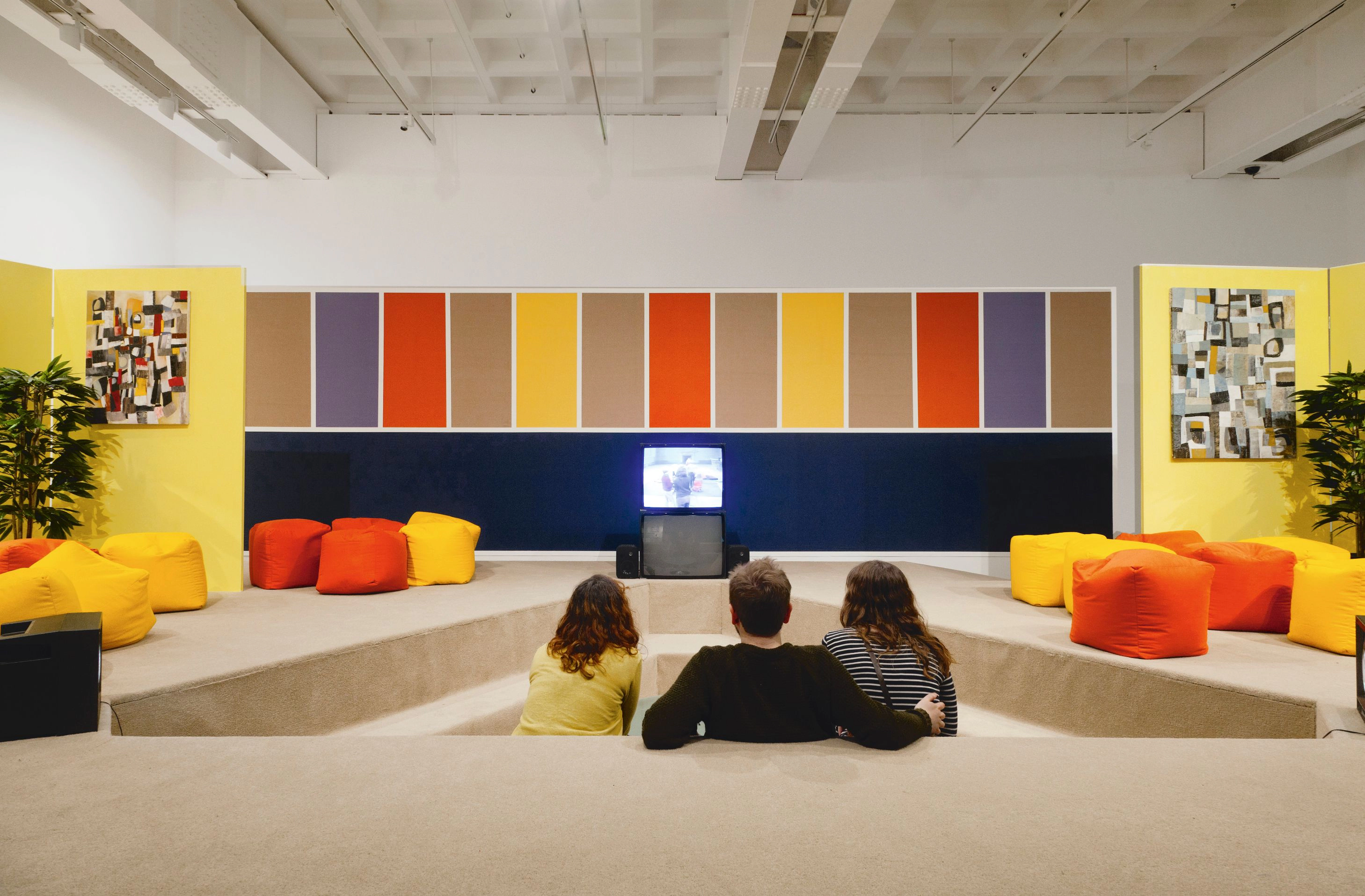 Open Forum is a re-creation of a 1970s-style TV studio, situated on a raised platform and filled with soft carpeting, colourful screens, cubes used as seating and a conversation pit. Visitors find themselves cast as performers in the space, as if they are a television presenter or a member of the studio audience. A work station behind the scenes is also on show, suggesting the presence of support staff and technicians, who would usually be invisible to the television viewer.