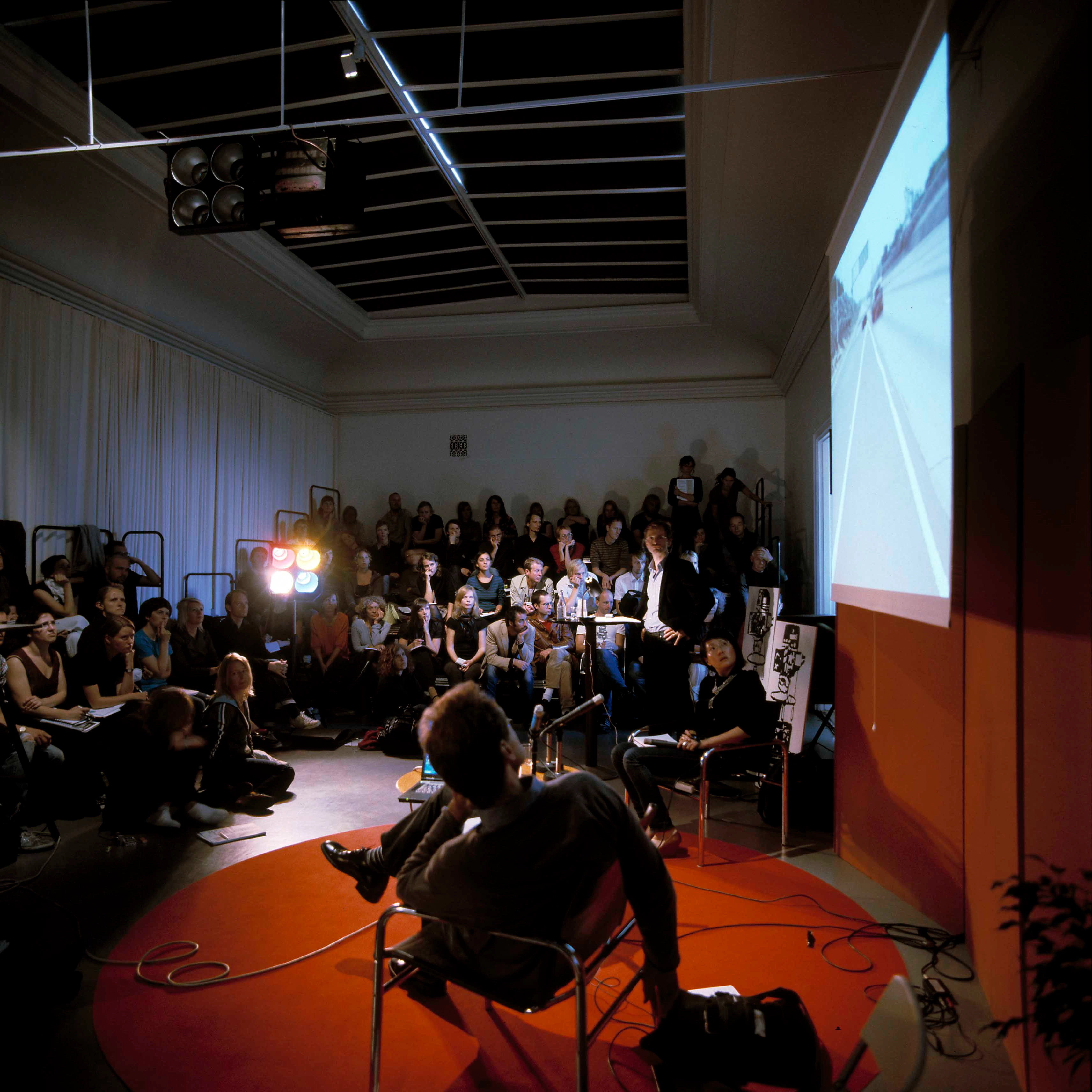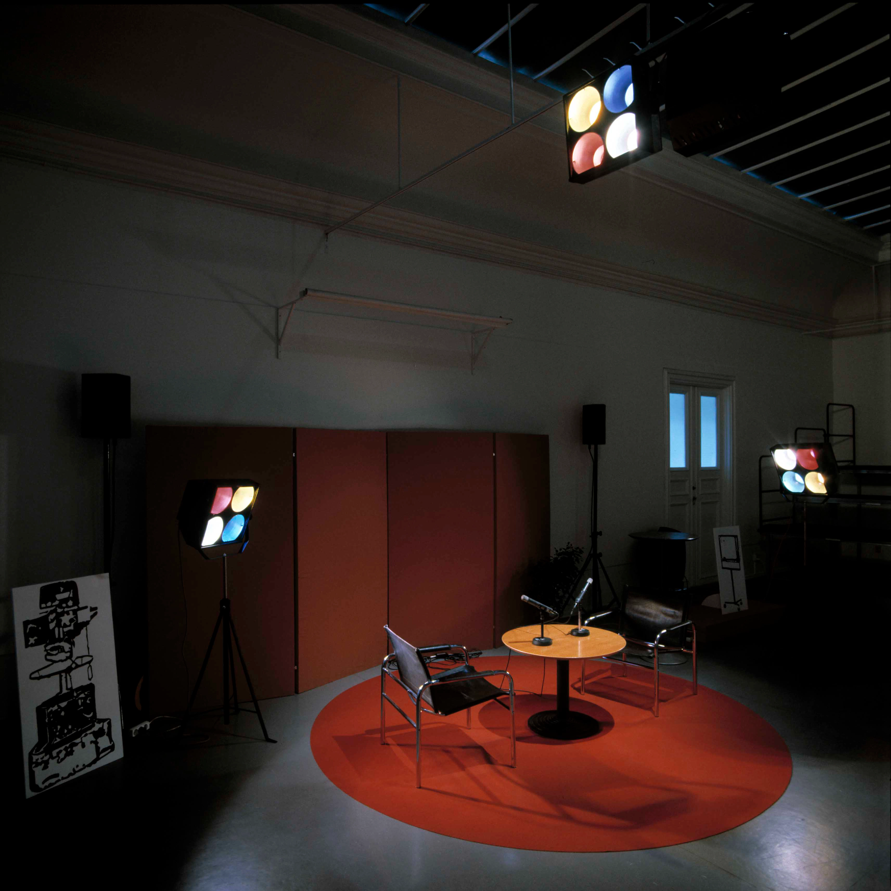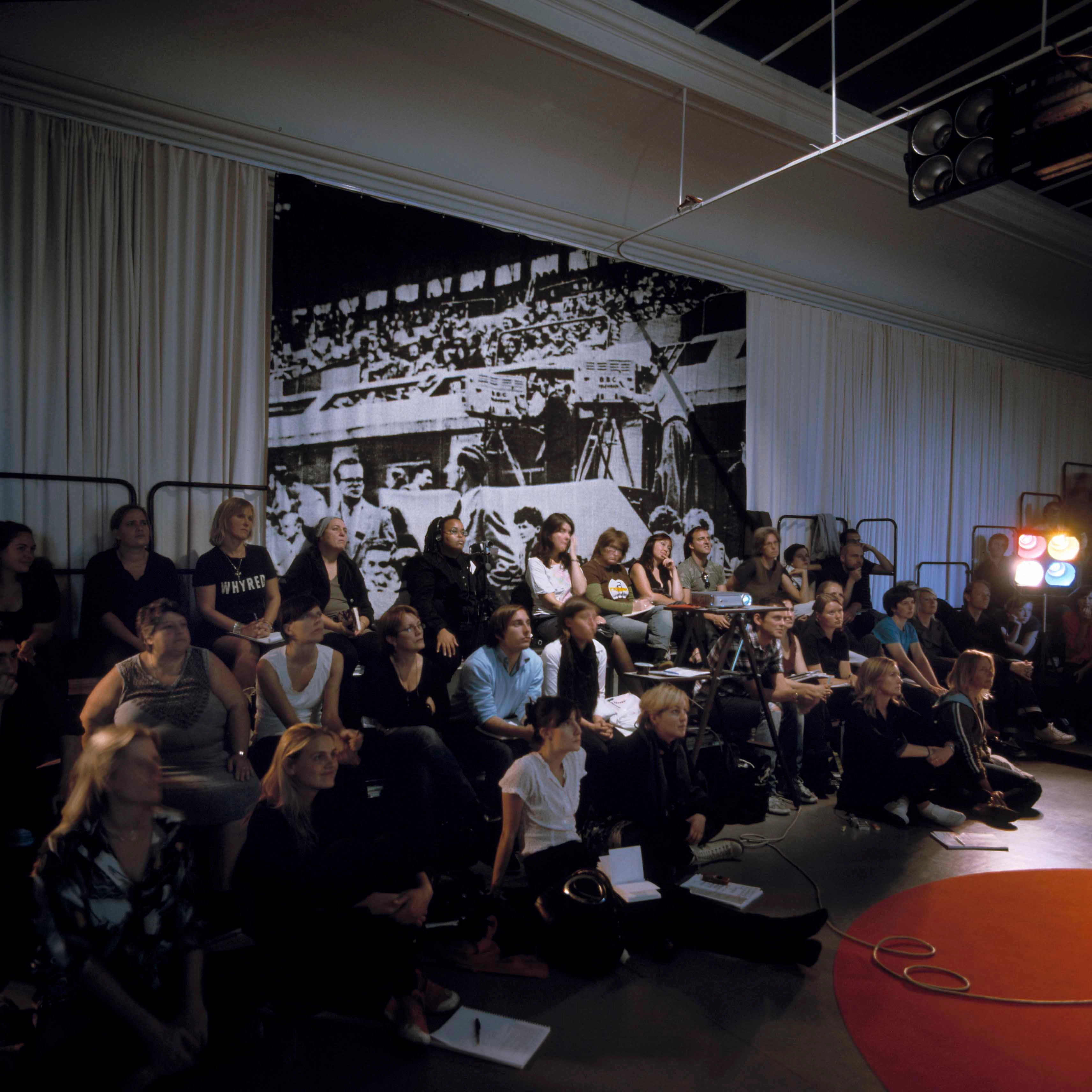 This installation was designed to be an environment in which the symposium could take place. Responding to the central theme – a critique of mainstream media’s representation of reality – it functioned like a television studio. As a result, participants were cast in the role of television presenters and studio audience respectively. Fiction and reality were blurred, as the space not only included genuine technicians and camera equipment to document the event, but also life-size cut-outs of cameras, monitors and technicians represented in a flat cartoon style, as well as a printed backdrop showing an audience of television journalists.