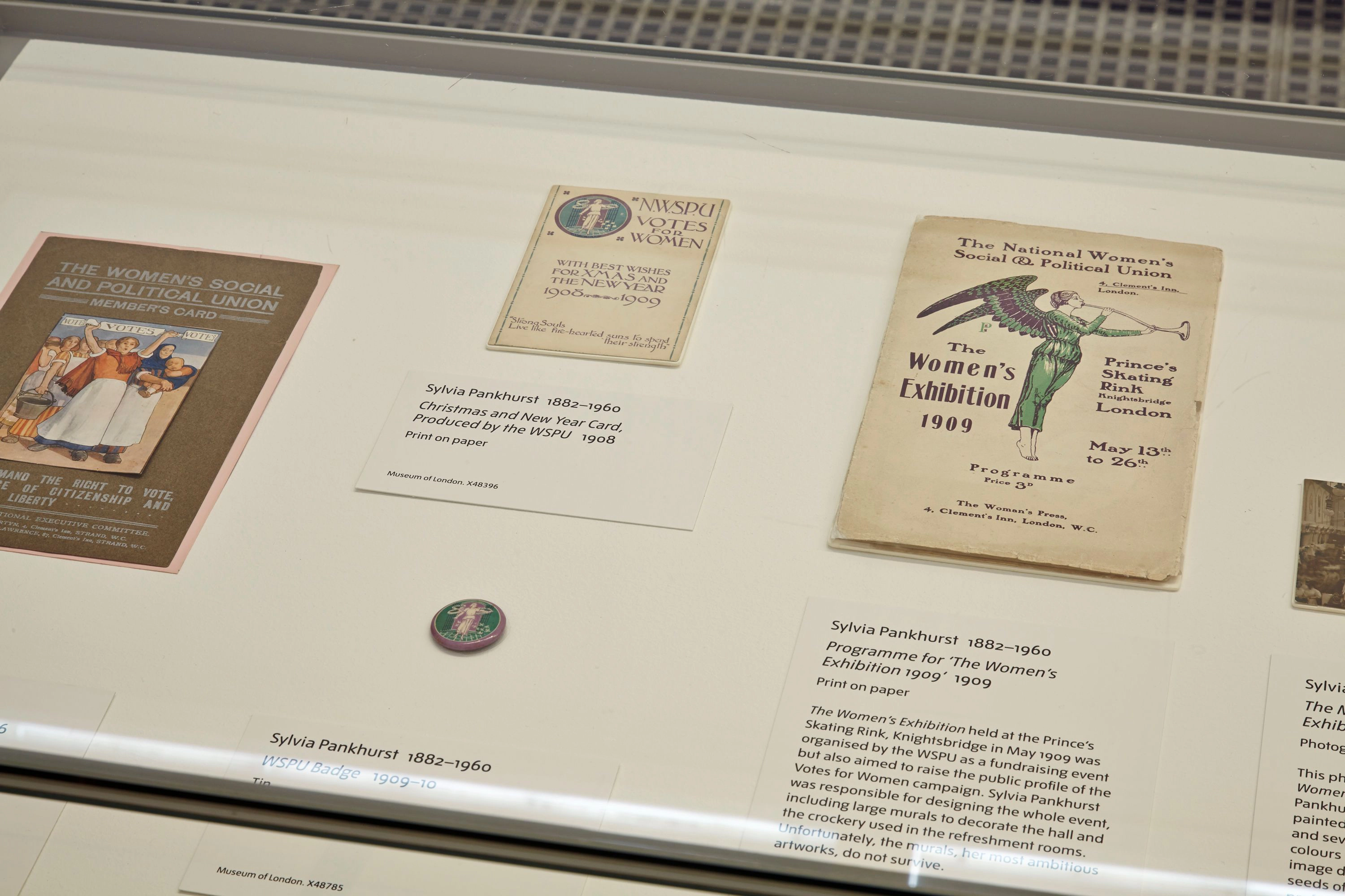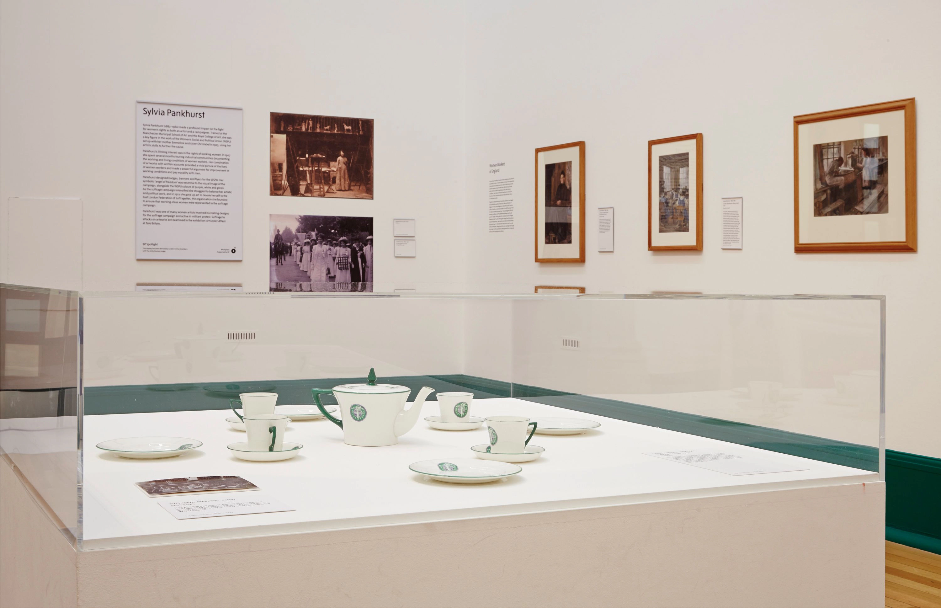 Shown alongside the paintings were examples of the Arts and Crafts influenced ‘angel of freedom’ logo, designed by Pankhurst for the WSPU and which appears on banners, a tea set sold to raise funds for the movement, as well as a certificate designed by Pankhurst and signed by the leaders of the WSPU. This was routinely awarded to suffragettes who had spent time in prison for the cause, along with the portcullis broach, which Pankhurst based on the gates of HM Prison Holloway, where she and many other suffragettes were incarcerated.