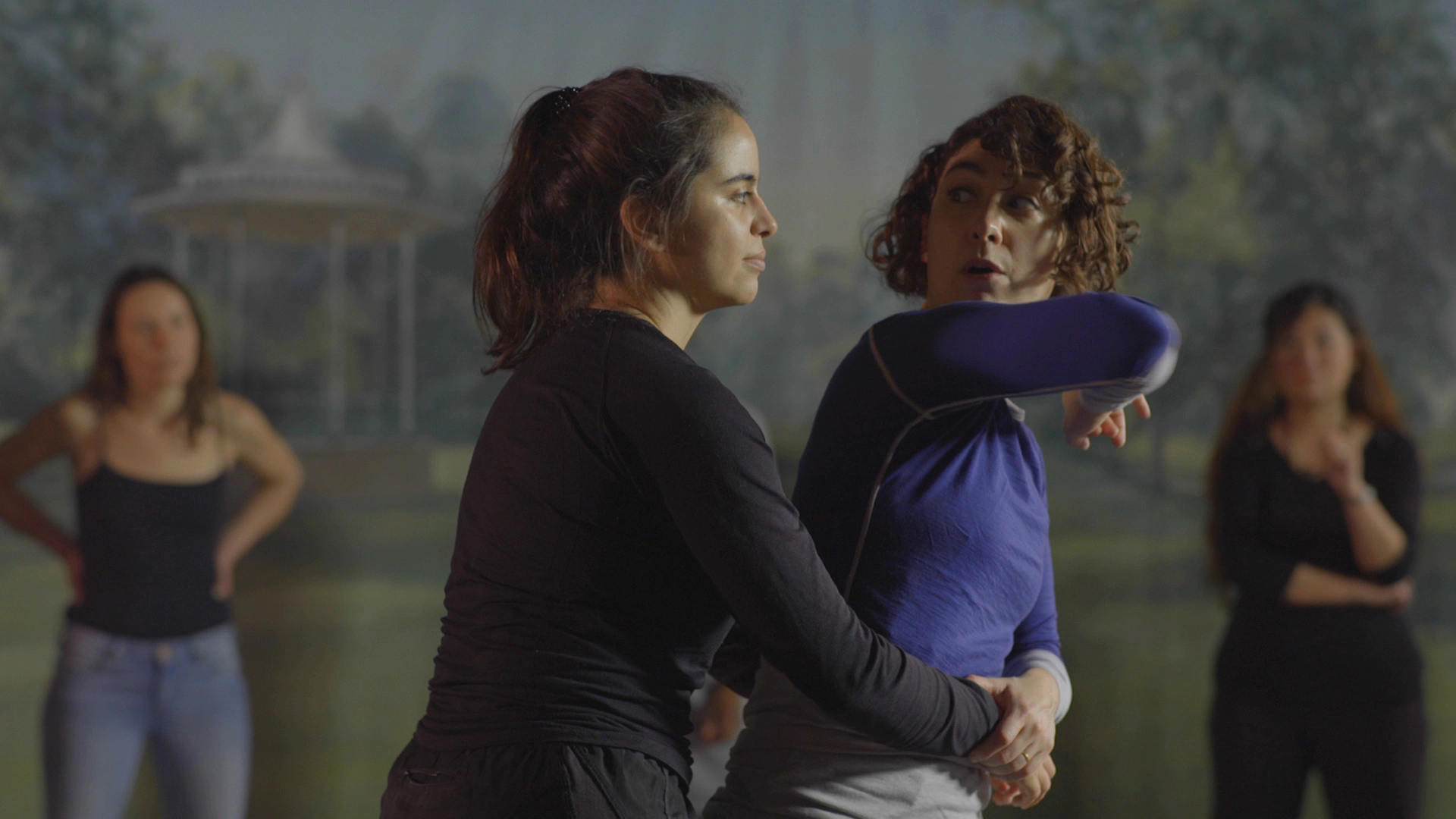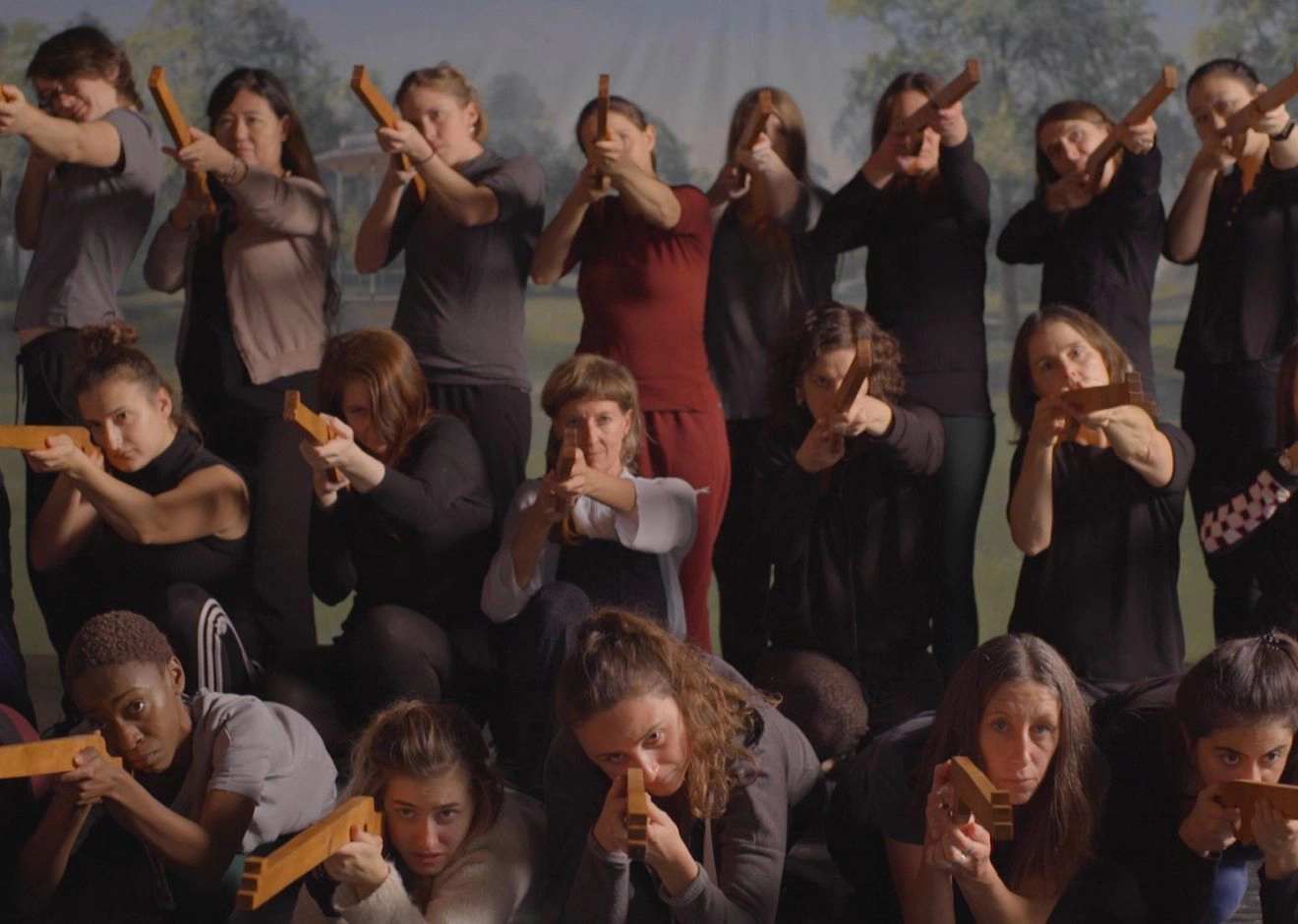 The camera follows the actions of a group of contemporary women as they engage in a self-defence workshop. The video dwells on the bodily and collective tactics women can learn to resist everyday violence as well as police aggression, and how they can take ownership of the situation. The two-channel film, focuses on some of the sophisticated techniques of self-defence and collaborative methods of feminist pedagogy that have been developed and practiced by feminist groups, especially in women’s spaces and activist organisations. We see the women engage in a learning process in which they struggle to overcome the taboos surrounding female aggression and anger. As they rehearse movements and practise Jiu-Jitsu throws, the participants build up to a recreation of an archival photograph of The People’s Army – a self-defence group that was part of the East London Federation of the Suffragettes (ELFS) – posing with guns in Victoria Park, London, around 1914. The video’s ultimate image is something like a tableaux vivant, or a moving history painting, which takes place in front of a painted theatrical backdrop of the park. Today the history of the suffragette movement is celebrated in the UK, but what is often left out is that in their time they were considered to be terrorists by the British state.