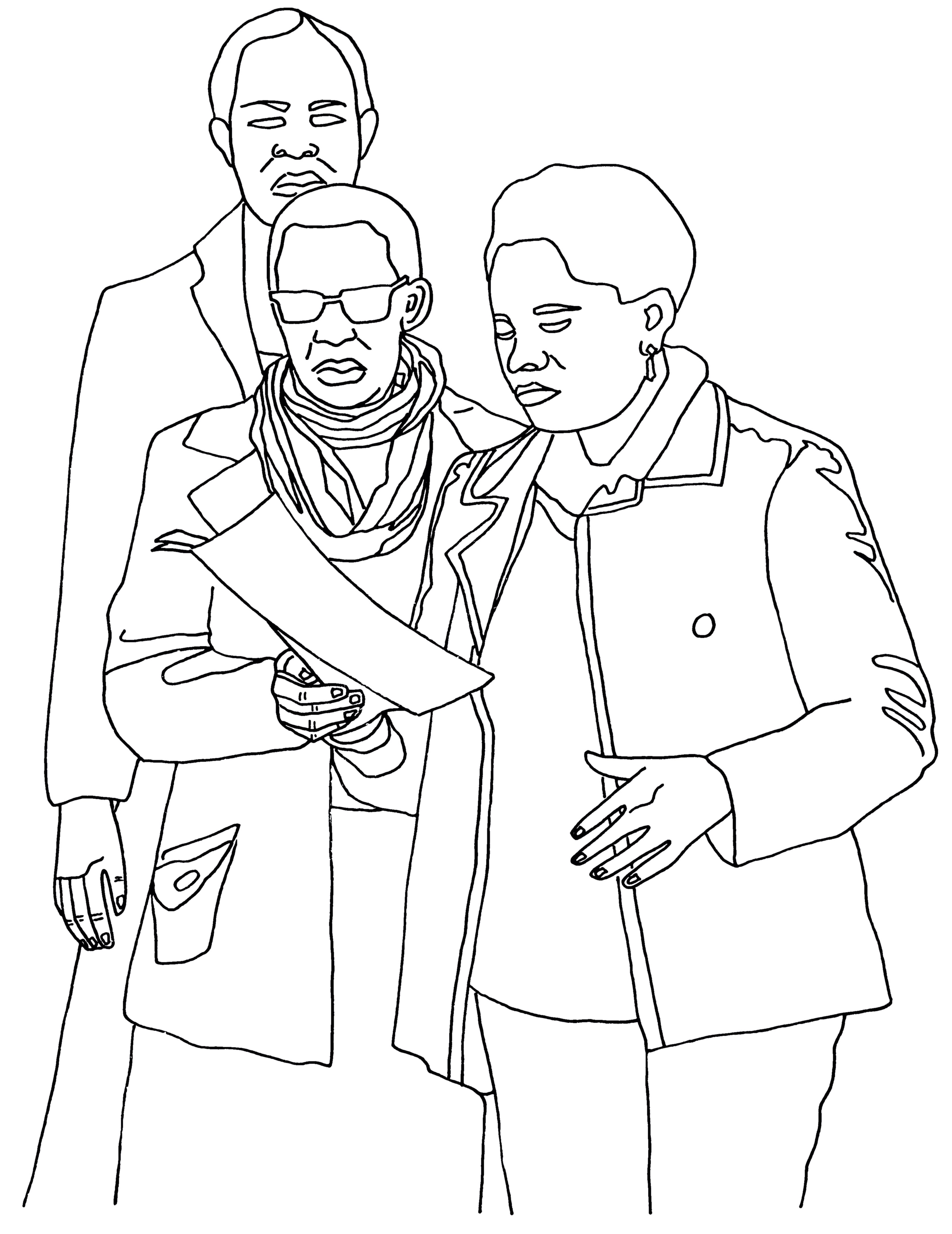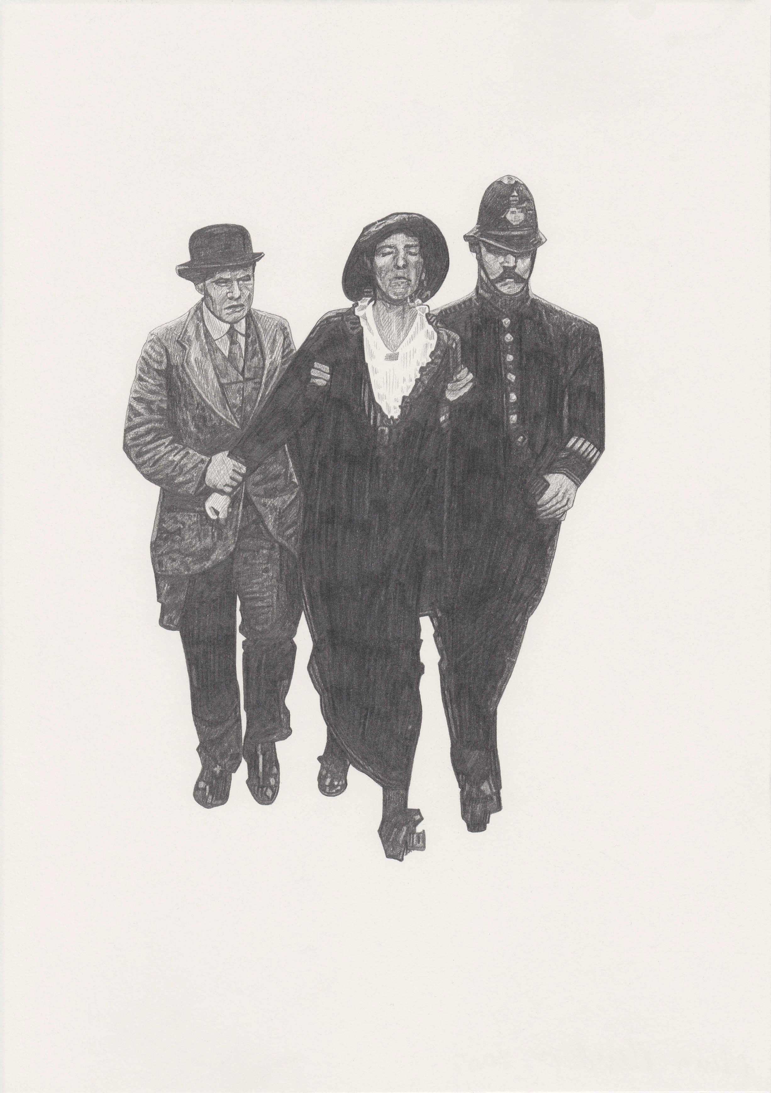 The pencil drawings are based on early twentieth century press photographs of suffragettes being apprehended by the police. These women are shown in all their individuality, whereas the identities of the men are masked by their uniforms, and the actions they perform are indistinguishable from those of the police officers who violently break up protests today.