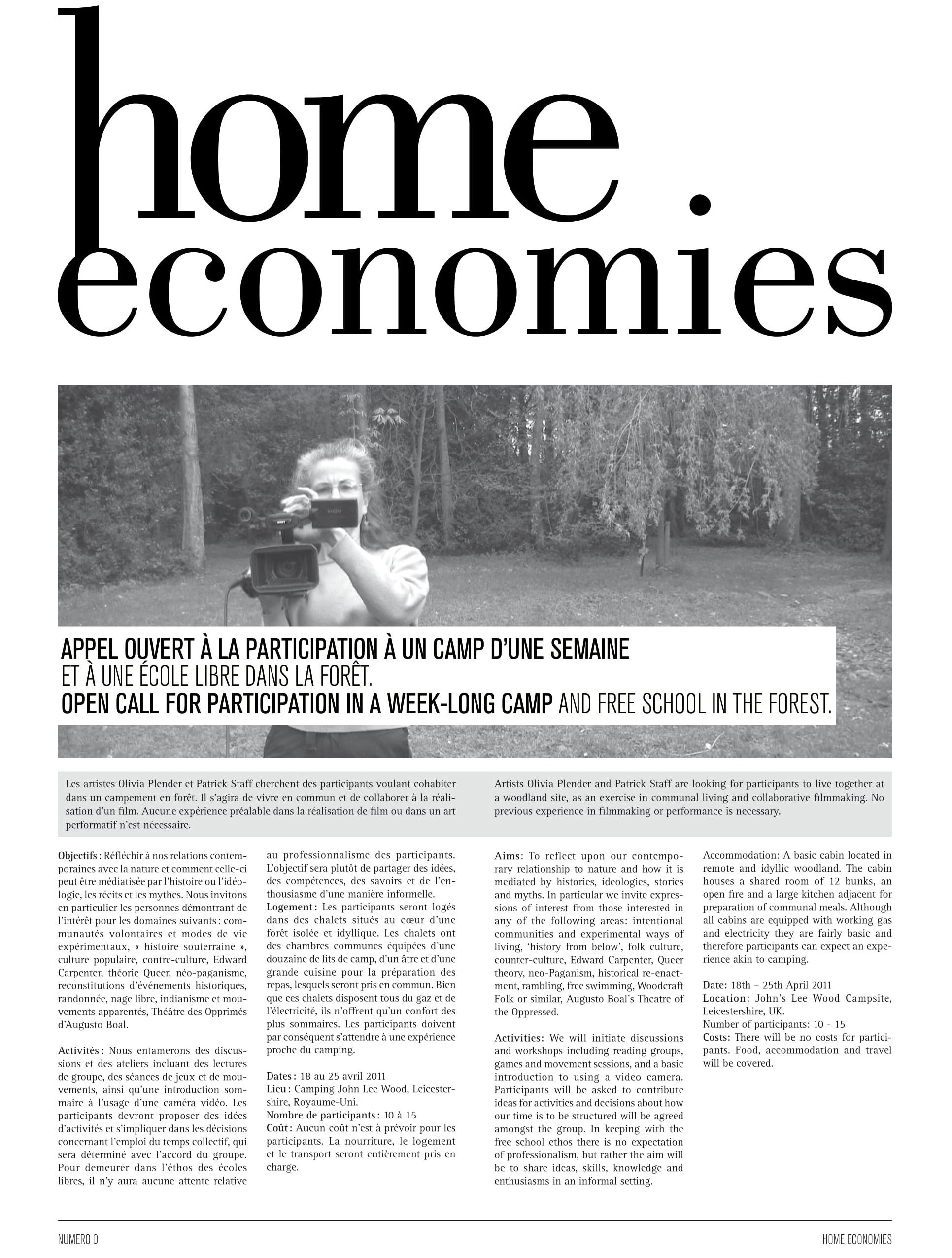 Home Economies was made to accompany the video Life in the Woods (2011). In the spring of 2011, P. Staff and I invited a group of fifteen participants to live together for a week in John’s Lee Wood, Leicestershire. Borrowing a format from early twentieth-century radical outdoor educational programmes, including the Kindred of the Kibbo Kift, the participants engaged in a process of mutual education, based around the activity of making a film together. The group included a historian, a bird watcher, an environmental activist, a self-identified witch, folk dancers, and several former commune members. The newspaper-style publication reflects on ‘back to nature’ movements, identity, group dynamics and the collaborative film-making process itself. It also includes recipes and instructions on how to do it yourself.
