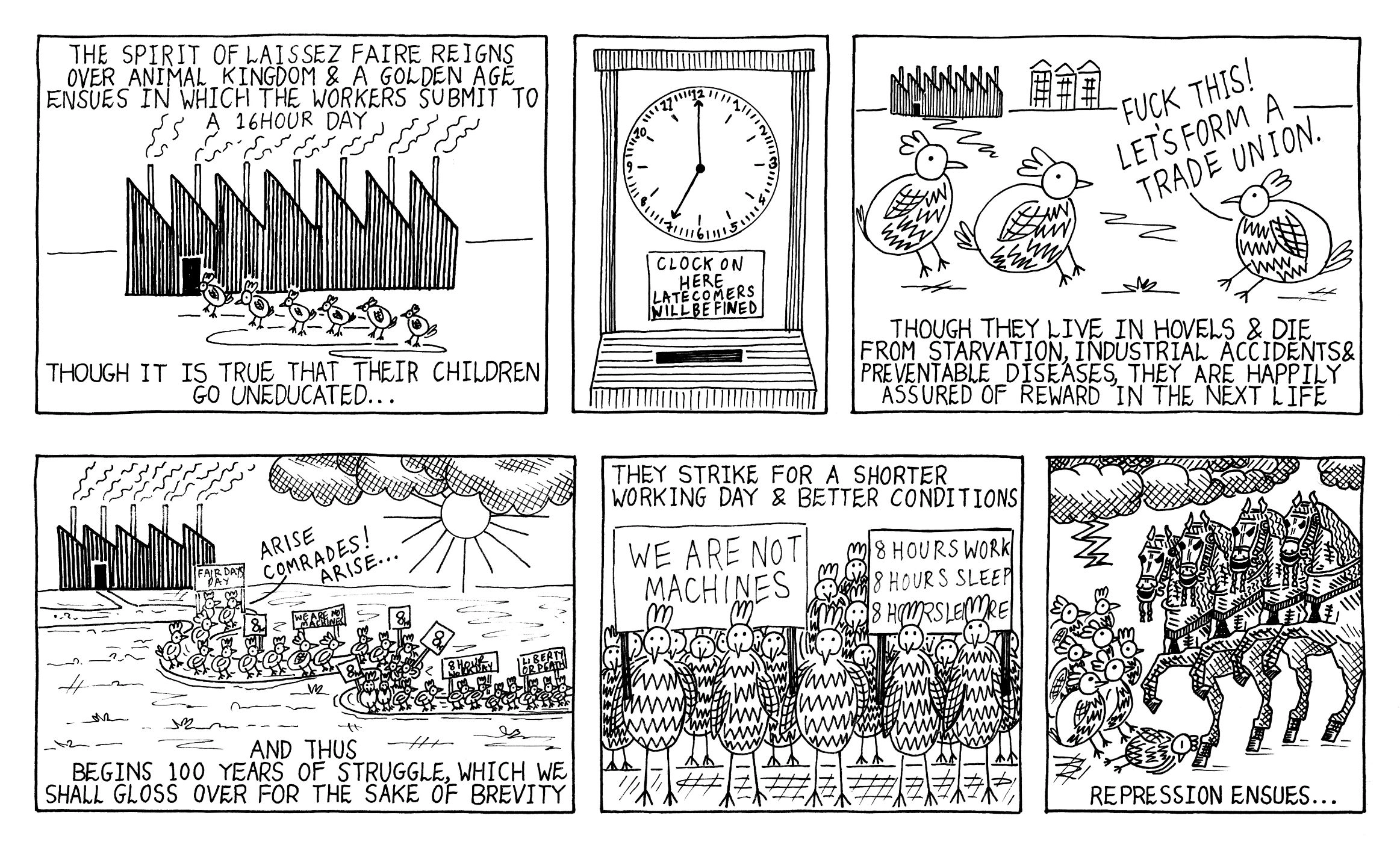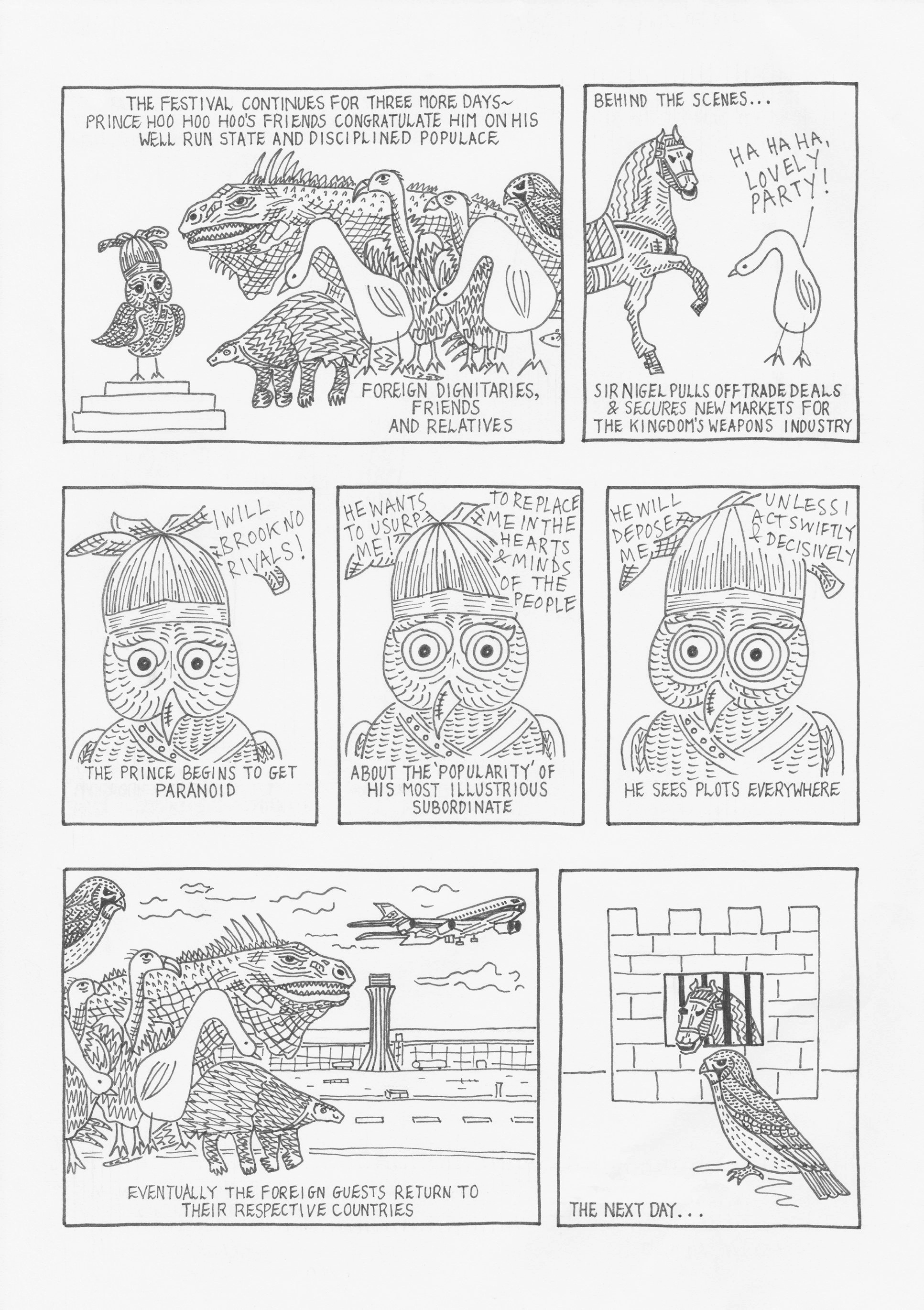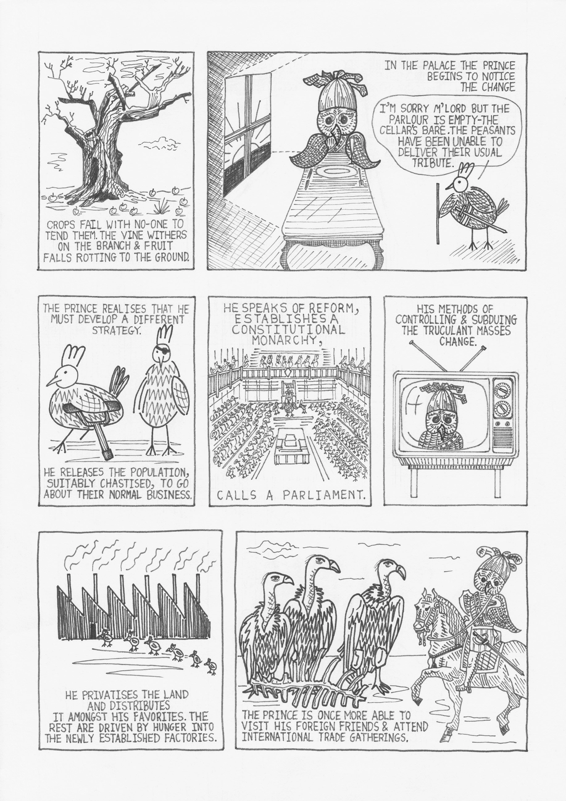 The comic book series The History of Animal Kingdom is a political satire about a nation of chickens ruled over by an owl, named Prince Hoo Hoo Hoo. Each episode follows the near continuous power struggle between the chickens and their leaders across centuries, as various political systems are imposed upon them from above. Suffering under a corrupt elite made up of the owl’s incompetent cronies – a horse, a swan, vultures and various other birds – the story follows Animal Kingdom’s transition from feudalism through to laissez-faire capitalism.
