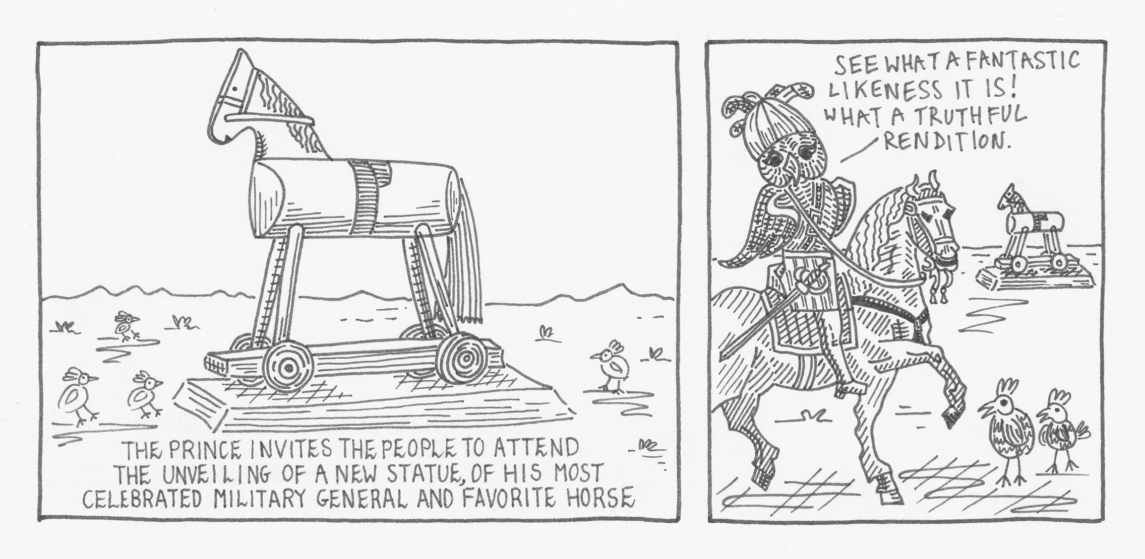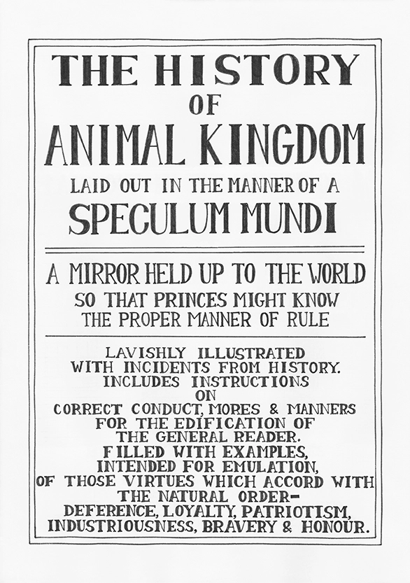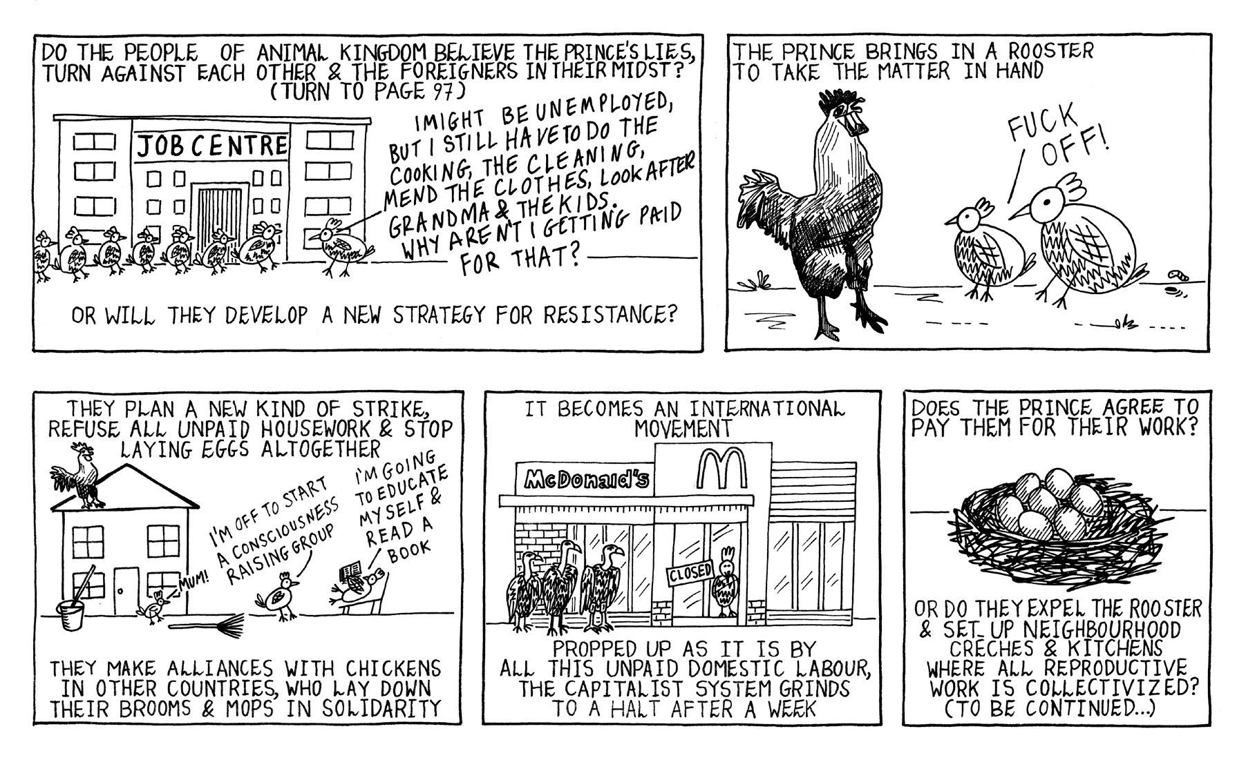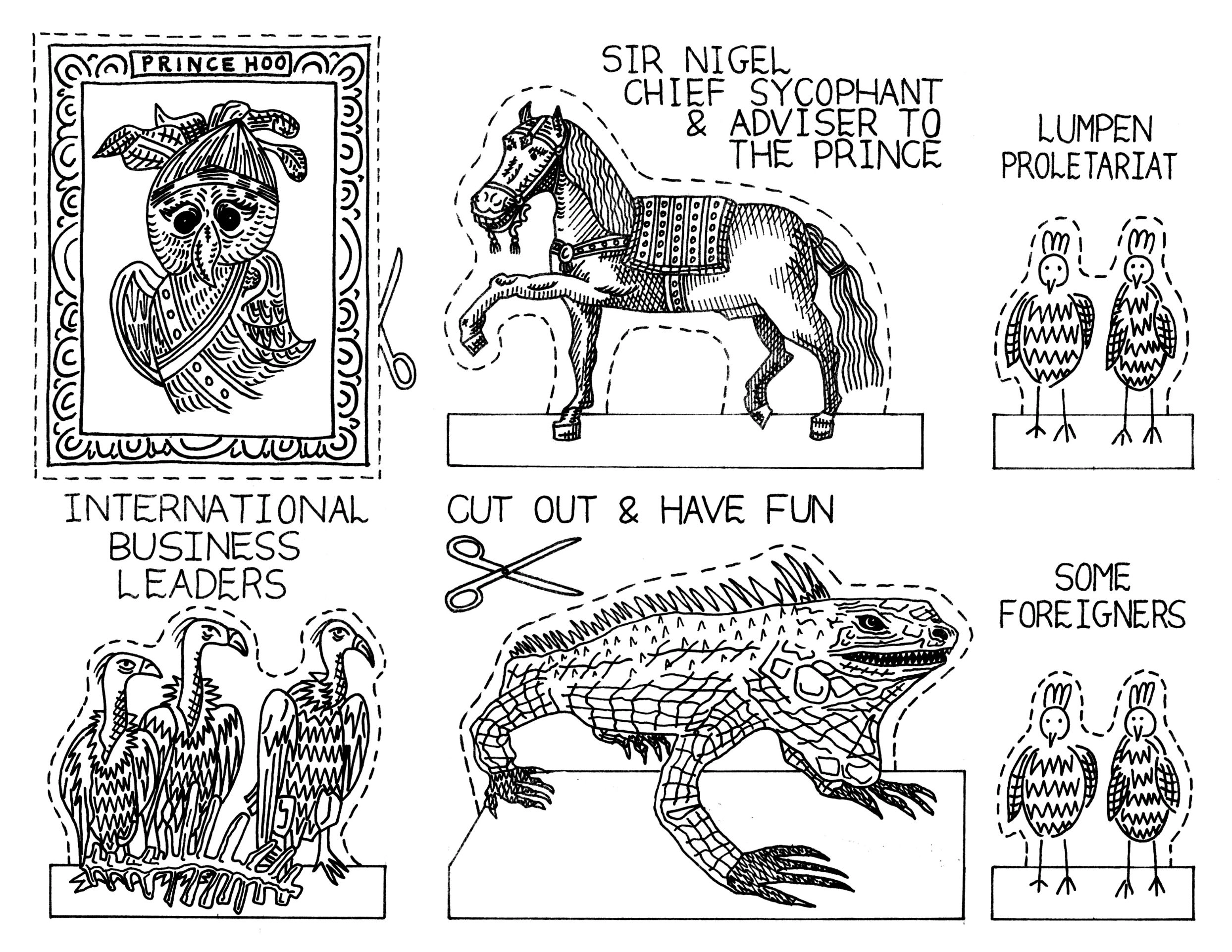 The comic book series The History of Animal Kingdom is a political satire about a nation of chickens ruled over by an owl, named Prince Hoo Hoo Hoo. Each episode follows the near continuous power struggle between the chickens and their leaders across centuries, as various political systems are imposed upon them from above. Suffering under a corrupt elite made up of the owl’s incompetent cronies – a horse, a swan, vultures and various other birds – the story follows Animal Kingdom’s transition from feudalism through to laissez-faire capitalism.