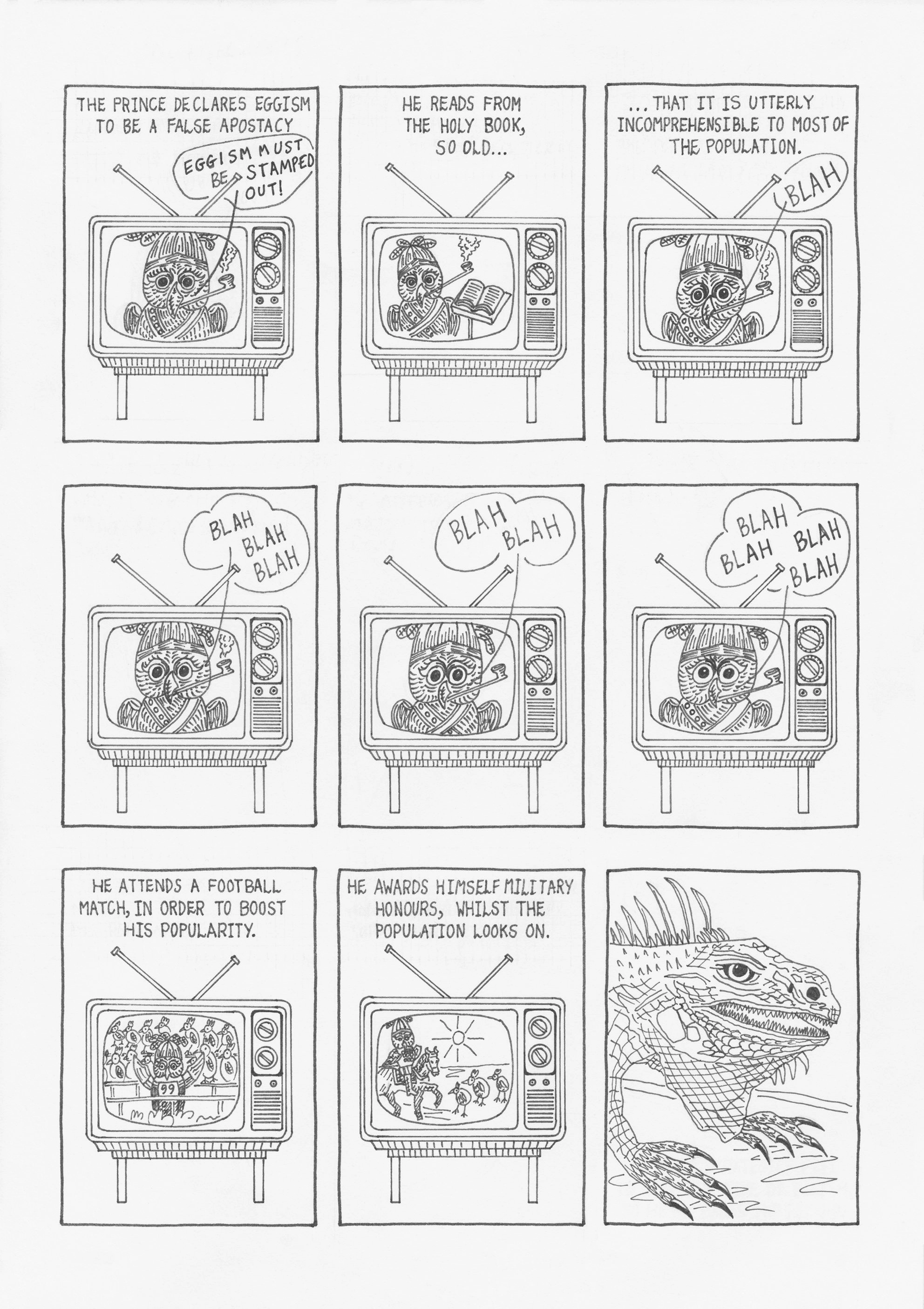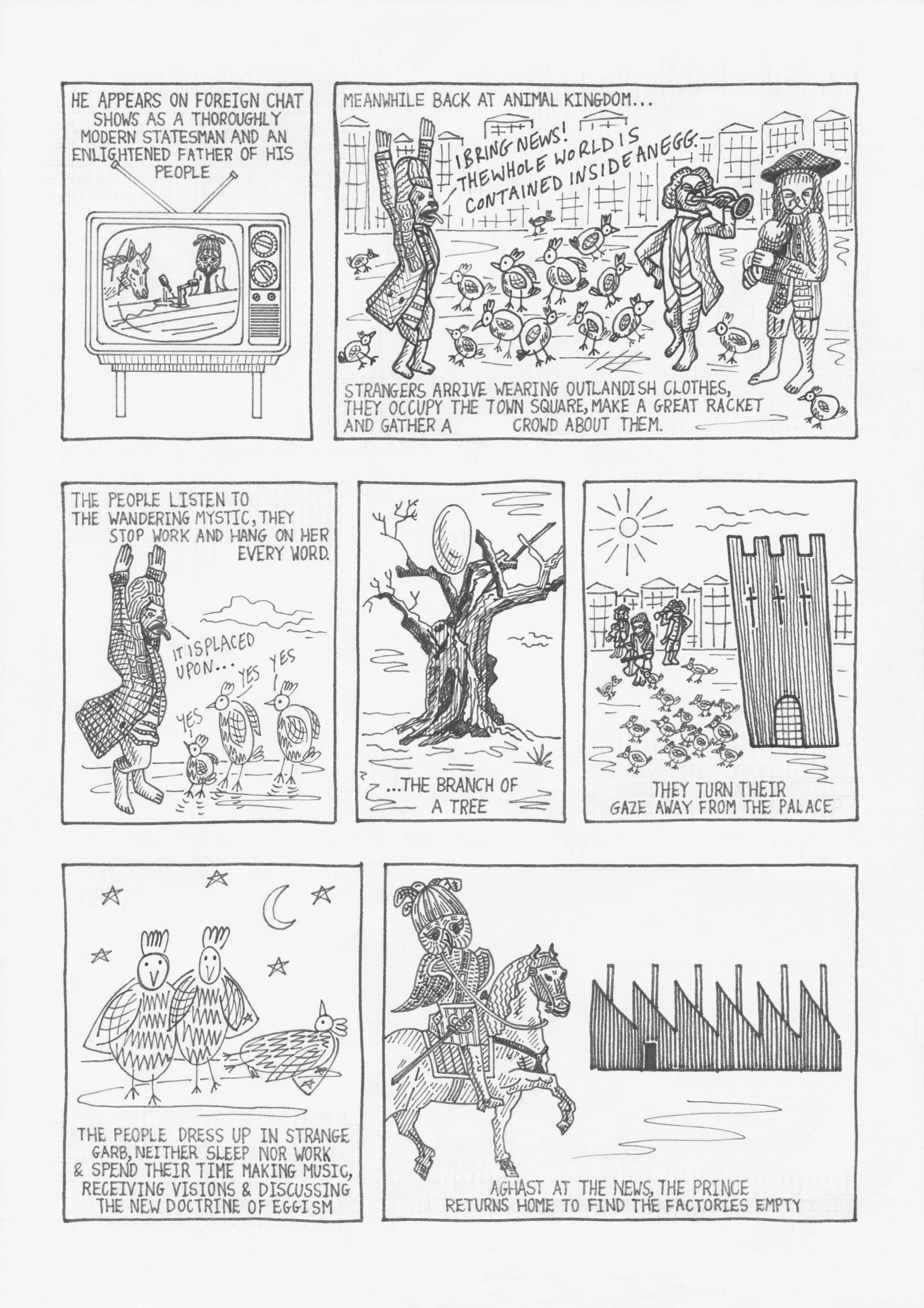In the prequel to The History of Animal Kingdom, commissioned by Swiss comics magazine Strapazin, the reader learns how the country has arrived at its current condition. In this episode the Prince industrialises Animal Kingdom, but, to his consternation, the chickens respond by founding a bizarre religious cult that brings the nation’s factories to a standstill.