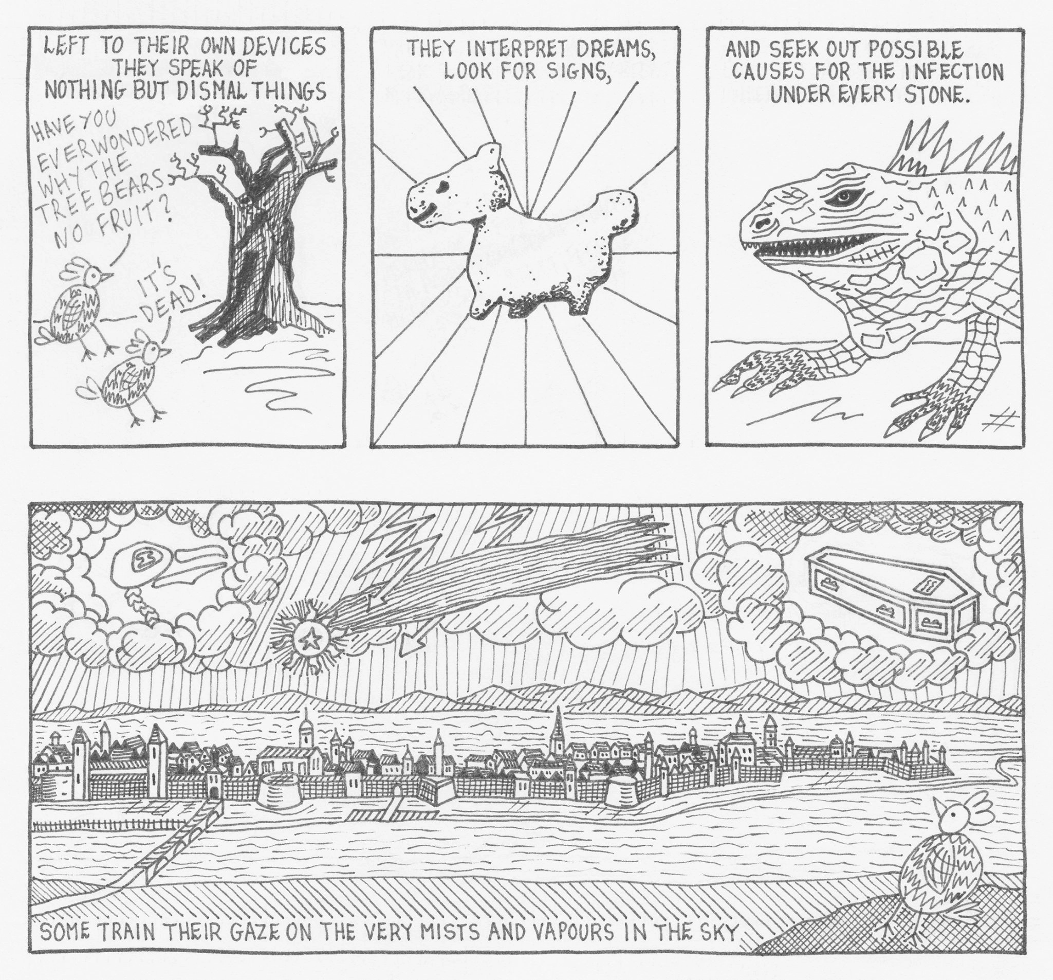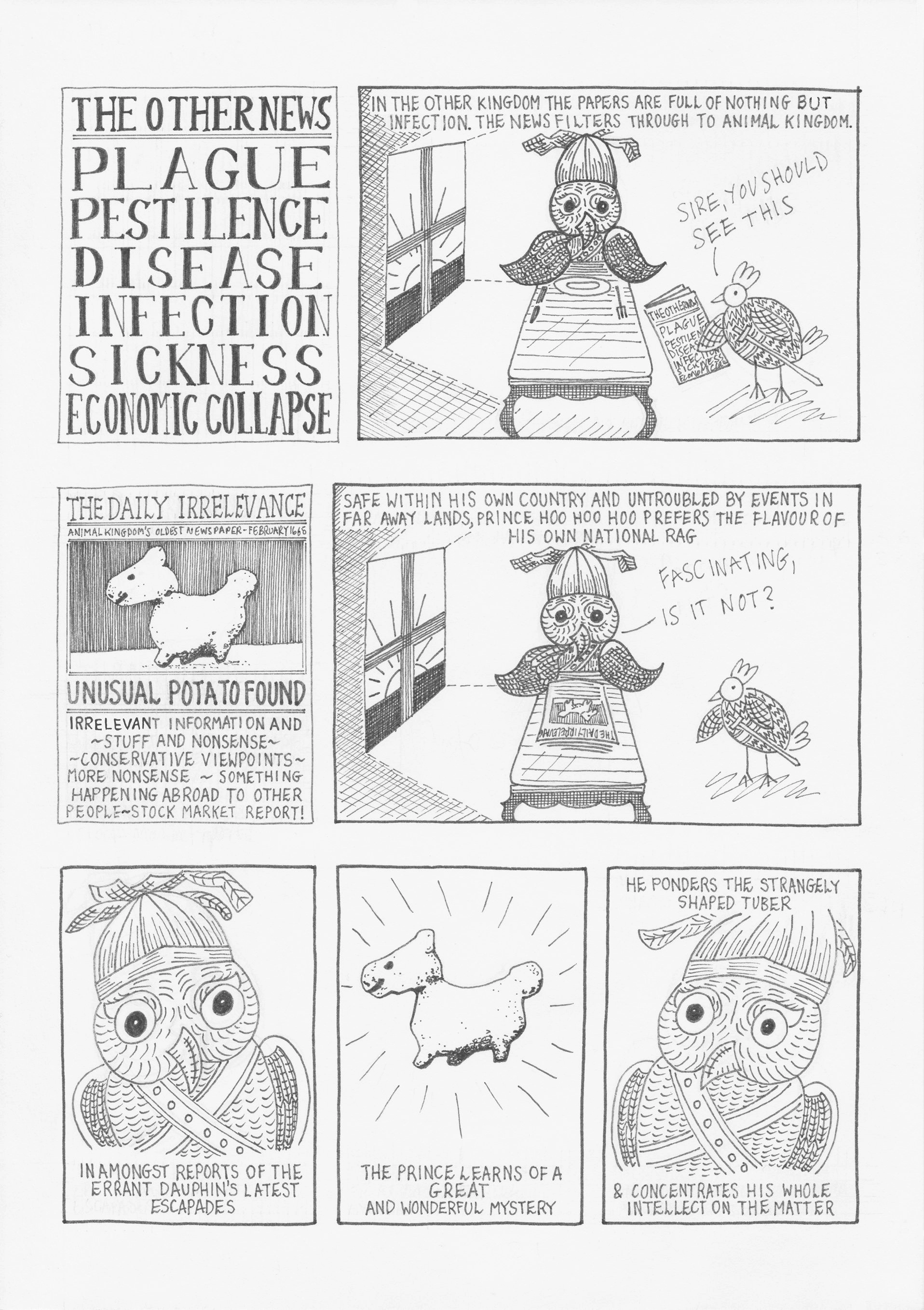 In Plague Year, the latest episode of The History of Animal Kingdom, the country is struck by a mysterious and deadly illness. Events in the fictional kingdom very loosely follow those unfolding in the real world, as the autocratic prince and his friends display a toxic combination of spectacular vanity and lack of competence as leaders. The chickens alternately rebel and despair, as Prince Hoo Hoo Hoo is distracted by such marvels as the discovery of an unusually shaped potato and being kidnapped by pirates. I started drawing Plague Year in March 2020, at the start of the Covid-19 pandemic, in order to entertain my friends whom I could no longer meet in person.
