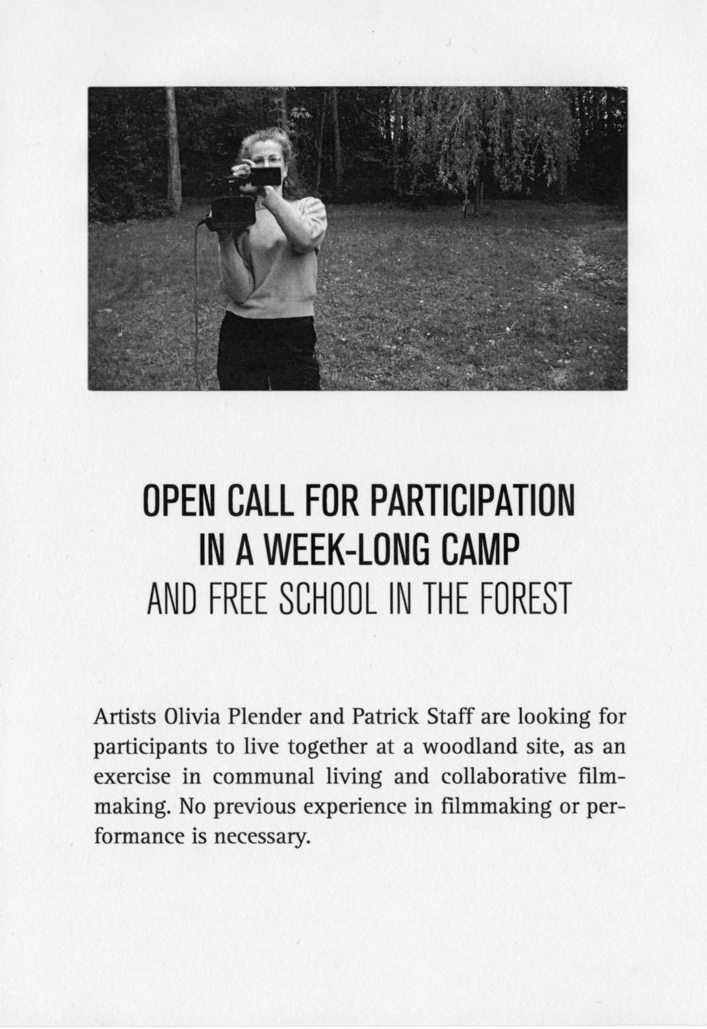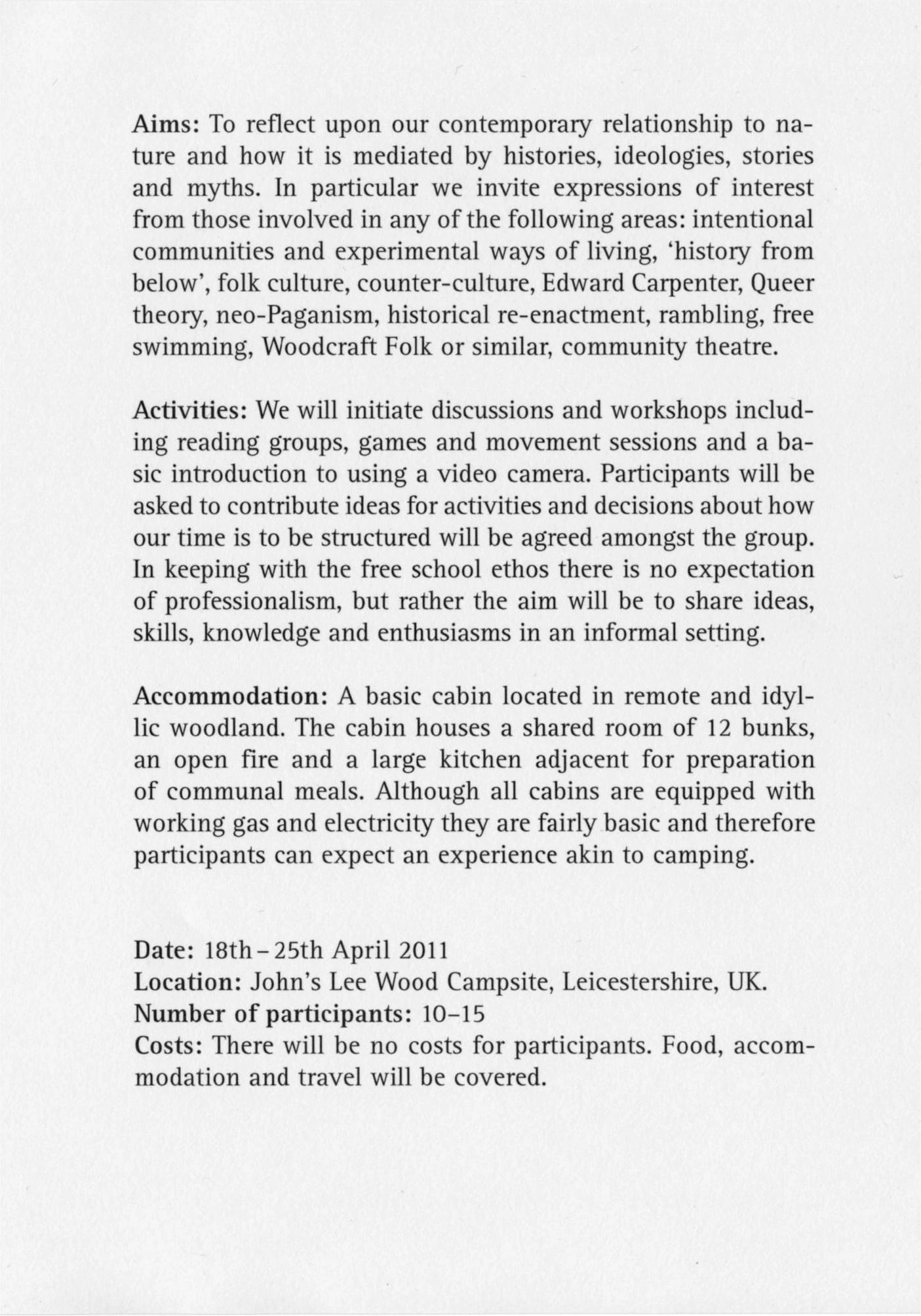 In the spring of 2011, P. Staff and I invited a group of fifteen participants to live together for a week at a Scout camp in John’s Lee Wood, Leicestershire (UK). Borrowing a format from early twentieth-century radical outdoor educational programmes, including Arts and Crafts influenced folk revivalists such as the Kindred of the Kibbo Kift, the participants engaged in a process of mutual education. The group included a historian, a birdwatcher, an environmental activist, a self-identified witch, folk dancers, and several former commune members. The resulting video and accompanying publication reflect on ‘back to nature’ movements, identity, group dynamics and the collaborative film-making process itself.