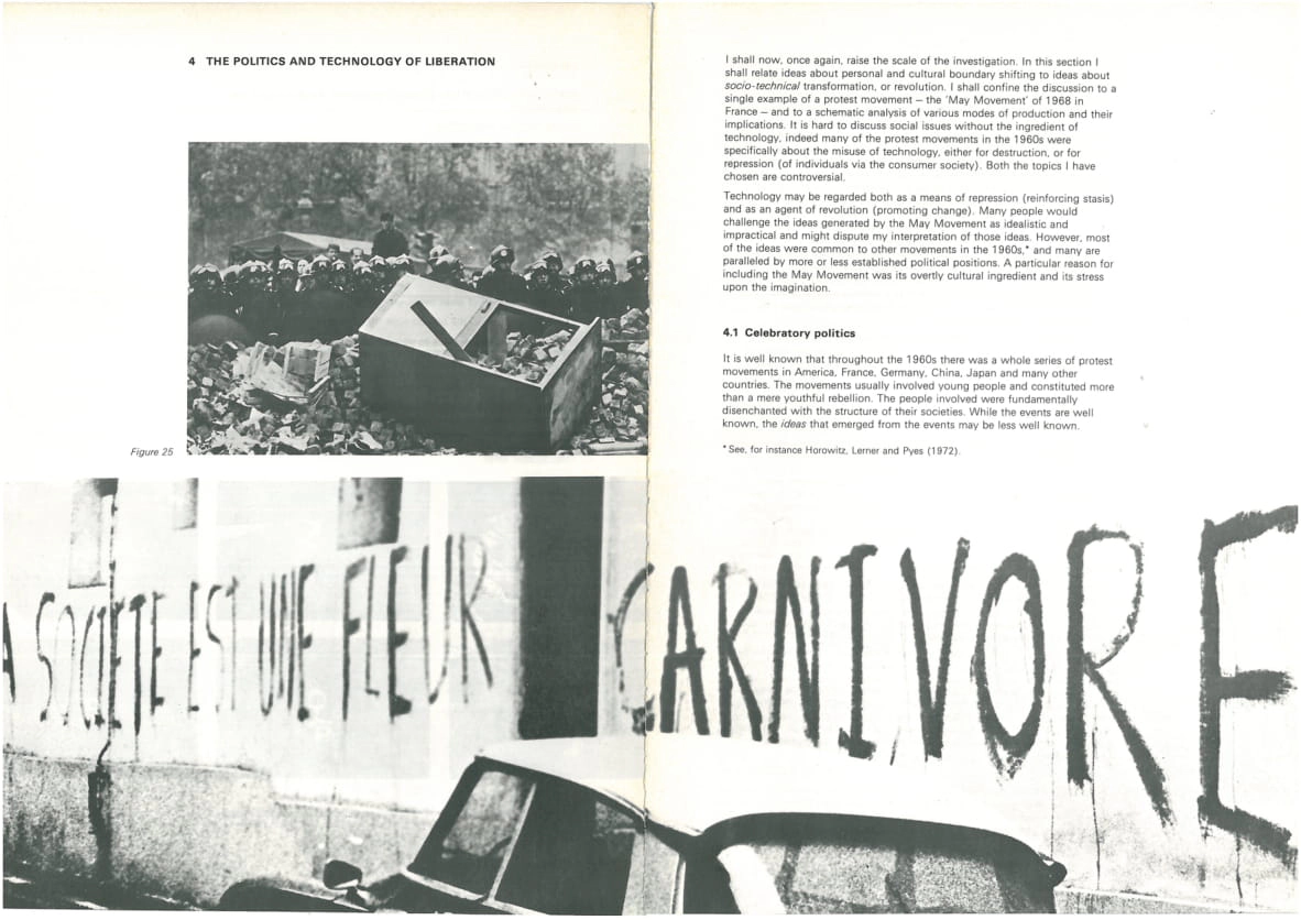 Showing on monitors in the installation were three programmes produced as course material, in collaboration with the BBC. In Children and Video (1976) young children, aged between seven and nine, work with light-weight video cameras and recorders to make their own television programme. Play and Place (1976) demonstrates how children’s play evokes the larger society and environment on a miniature scale. In Whatever Will Be (1977), futurologist James Dator analyses the modern world and suggests how it can be improved through alternative lifestyles, communes and adventure playgrounds.