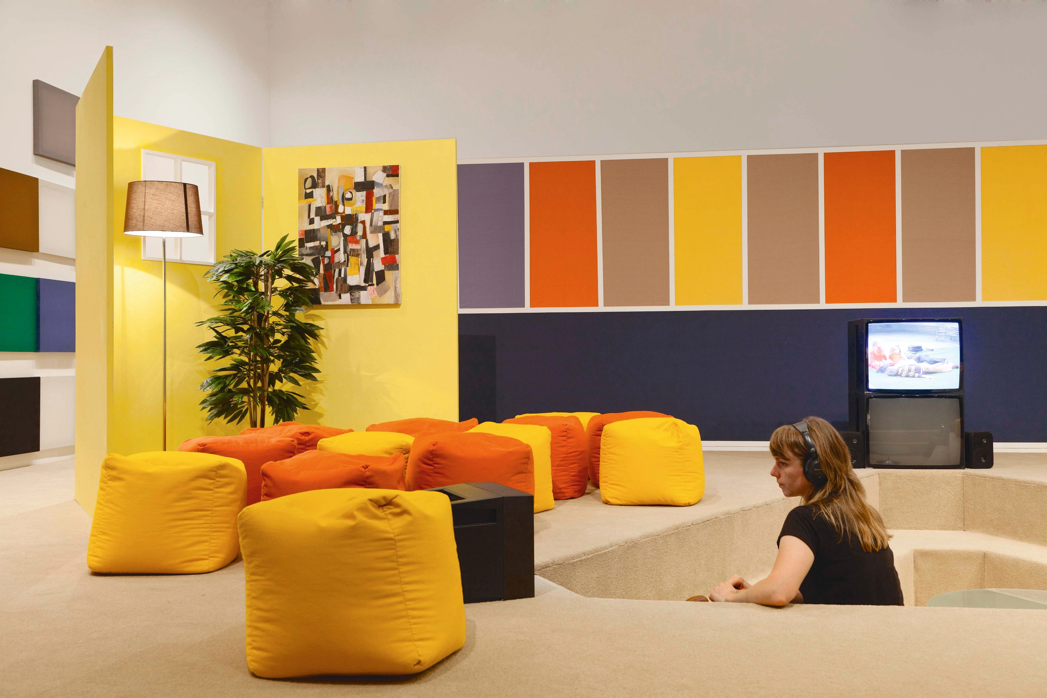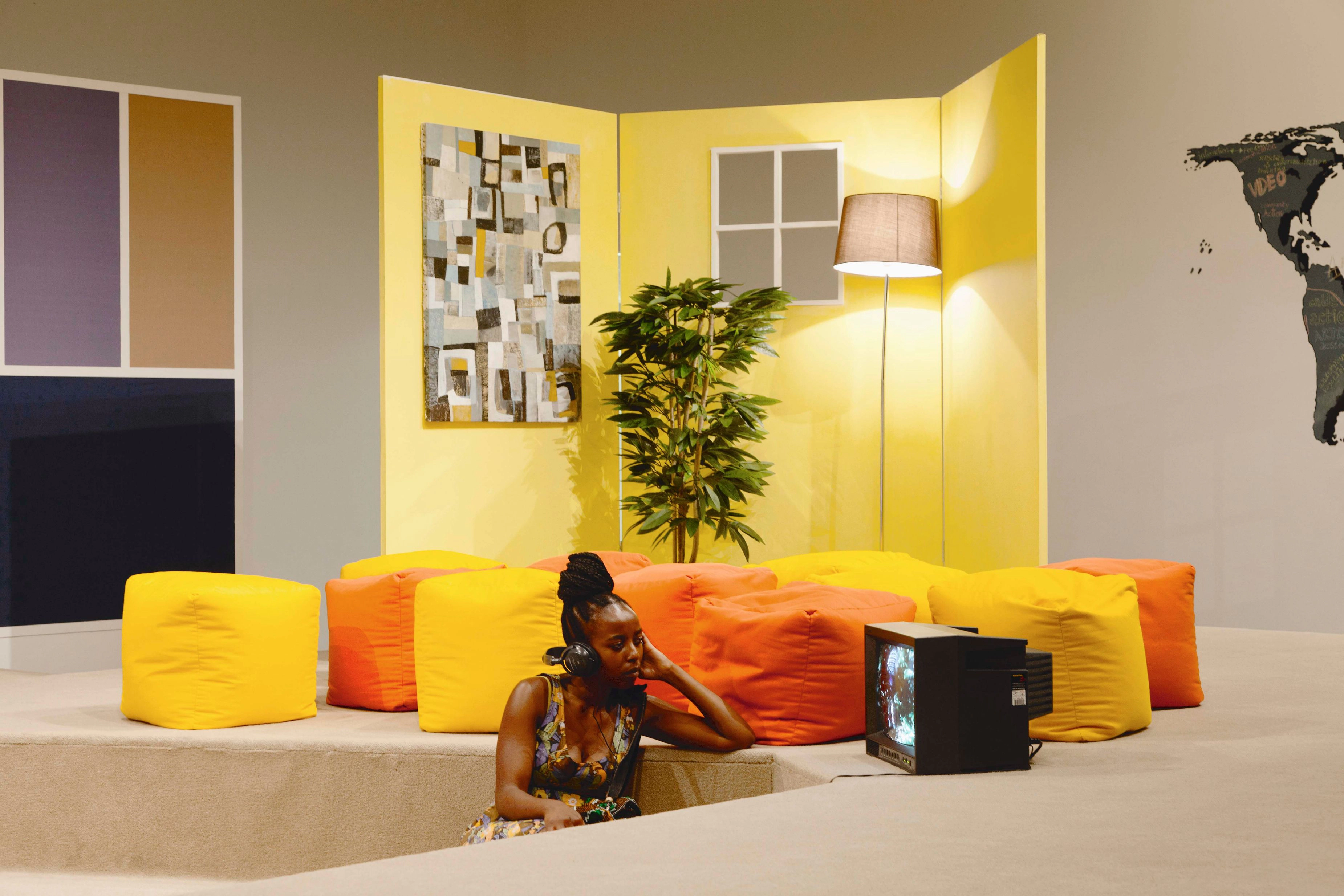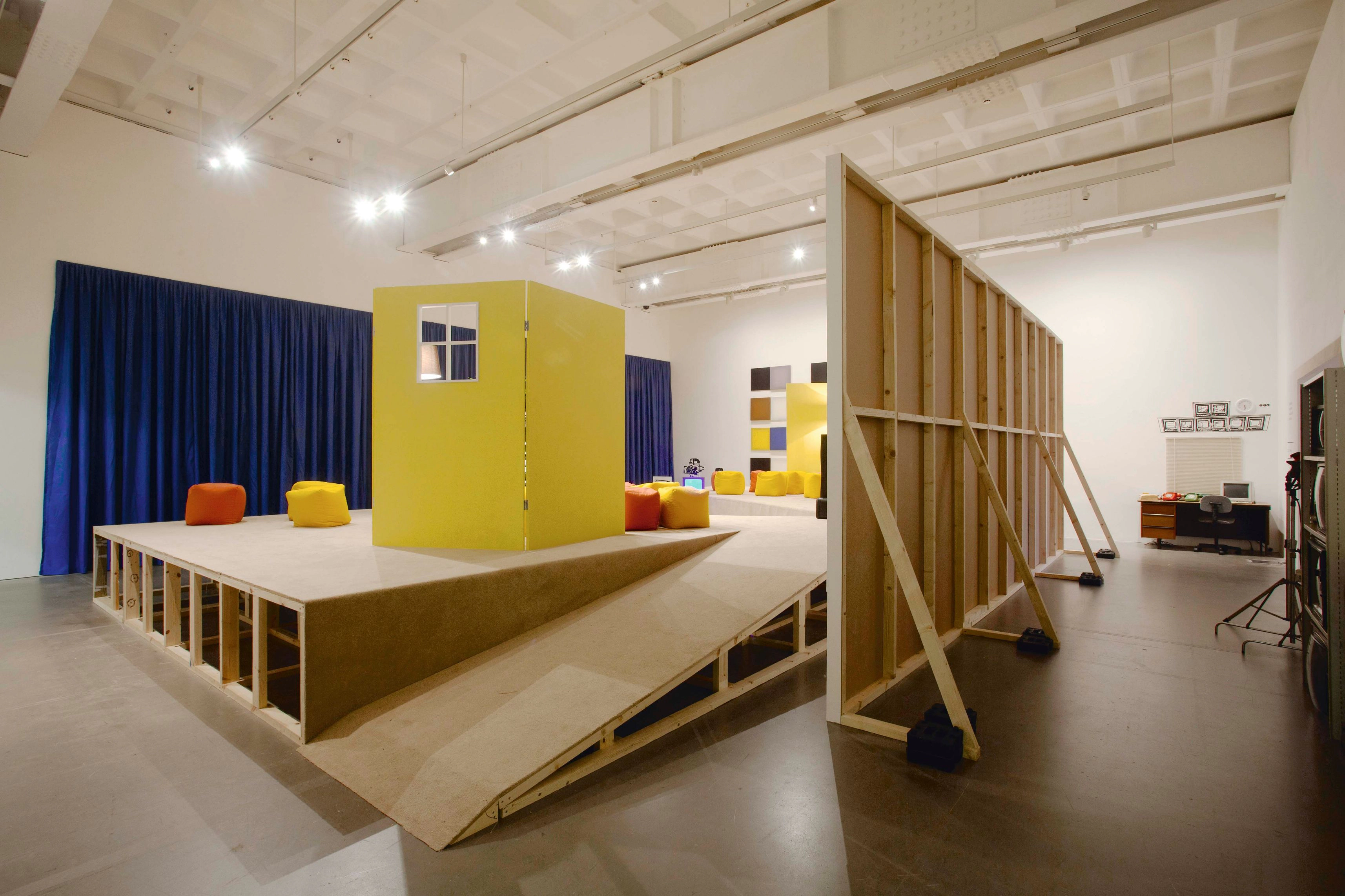 Open Forum is a re-creation of a 1970s-style TV studio, situated on a raised platform and filled with soft carpeting, colourful screens, cubes used as seating and a conversation pit. Visitors find themselves cast as performers in the space, as if they are a television presenter or a member of the studio audience. A work station behind the scenes is also on show, suggesting the presence of support staff and technicians, who would usually be invisible to the television viewer.