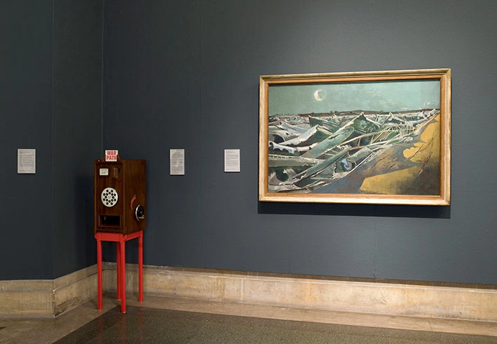 installation view of sculpture dispensing game, next to Totes Meer (1941), oil on canvas by Paul Nash