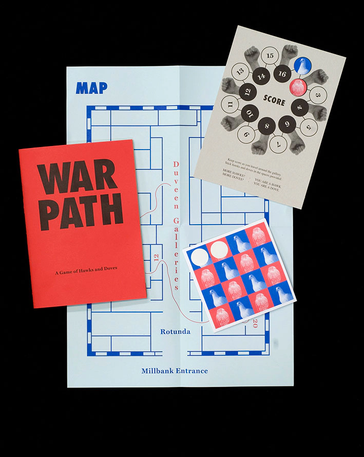 In 2006 I was invited to run a project with a group of young people (aged 15–21), for Visual Dialogues, based in the education department at Tate Britain. We were tasked with responding to an artwork by Mark Wallinger, titled State Britain (2007), about anti-Iraq-War protester Brian Haw. This led to a year of research into the condition of British democracy, which included field trips to the Houses of Parliament, the grave of William Blake, and 56a Infoshop (an anarchist social centre) among other sites, interviewing people along the way. The final outcome was War Path, a game developed collaboratively, which visitors to Tate Britain could play in the museum. A machine placed next to a painting by Paul Nash dispensed the game in exchange for a penny. The player received a kit that included a booklet, stickers and a map of Tate Britain – leading them around various war-themed artworks in the collection and posing a moral question at each stop. The target was to determine whether the player was a dove or a hawk.